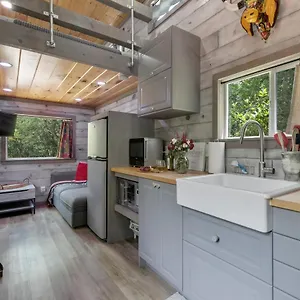 Stunning Modern Tiny Home With Grill comes with 1 bedroom, a small kitchen and 1 bathroom.